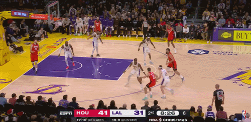 但詹姆斯此举导致火箭中锋申京完全无人看管,虽然谢泼德投篮不中,但火箭有着5打4的人数优势,申京轻松进入内线完成补篮得分。