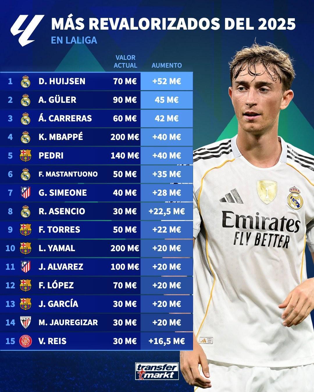 德转列2025年西甲球员身价涨幅TOP15: