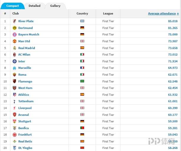 德转统计2025年全球顶级联赛俱乐部场均观众数据中,河床、多特、拜仁排在前三,中超球队大连英博排在第20位。