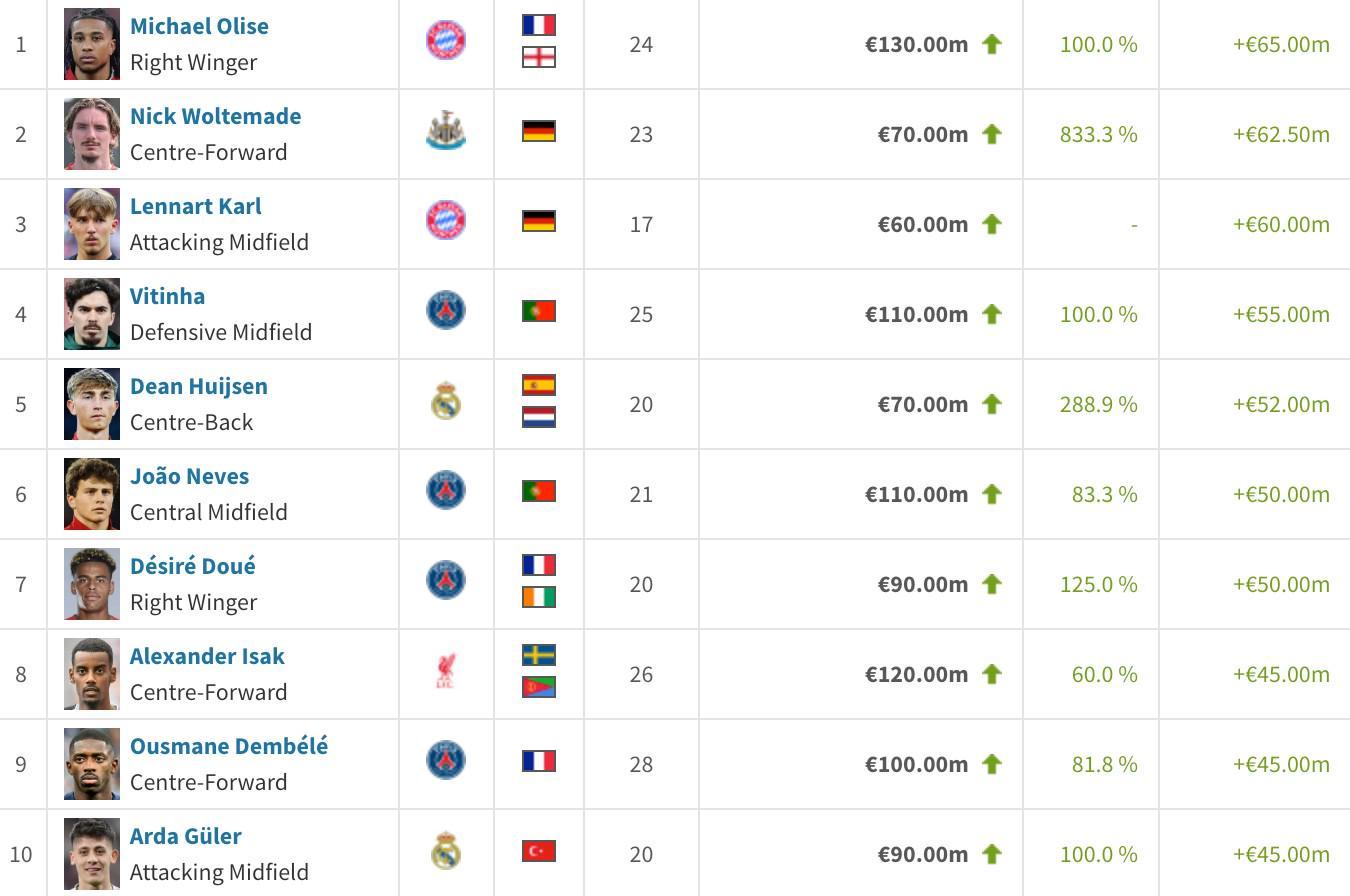1. 奥利塞(拜仁慕尼黑) +6500万欧元(+100%) 1.3亿欧元