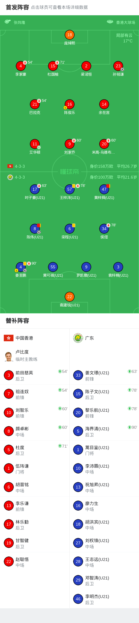 省港杯首回合中国香港2-2九人广东,姜至鹏破门,孙铭谦世界波