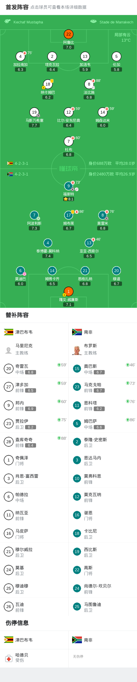 北京时间12月30日非洲国家杯 小组赛 第3轮,津巴布韦对阵南非。津巴布韦马斯万希塞破门。南非莫雷米破门,福斯特破门,阿波利斯破门,莫迪巴自摆乌龙。最终比分津巴布韦 2-3 南非。