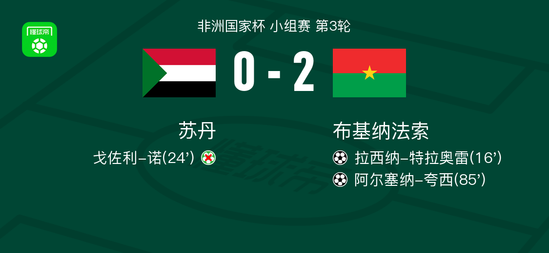 北京时间1月1日非洲国家杯 小组赛 第3轮,苏丹对阵布基纳法索。布基纳法索拉西纳-特拉奥雷破门,阿尔塞纳-夸西破门。最终比分苏丹 0-2 布基纳法索。