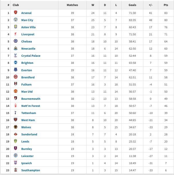 英超2025年积分榜:阿森纳83分居首,曼城第二利物浦第四