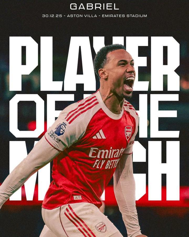 在今天凌晨进行的英超第19轮比赛中,阿森纳主场4-1击败阿斯顿维拉,赛后,加布里埃尔被阿森纳评为本场比赛队内最佳球员。
