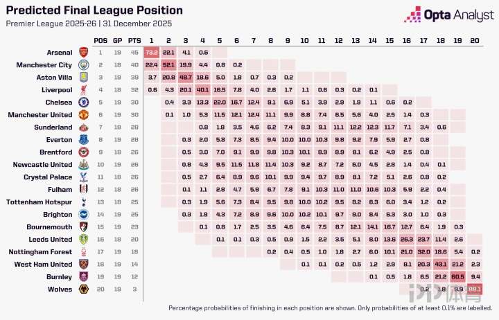 OPTA列本赛季英超夺冠概率:阿森纳73% 利物浦0.6%