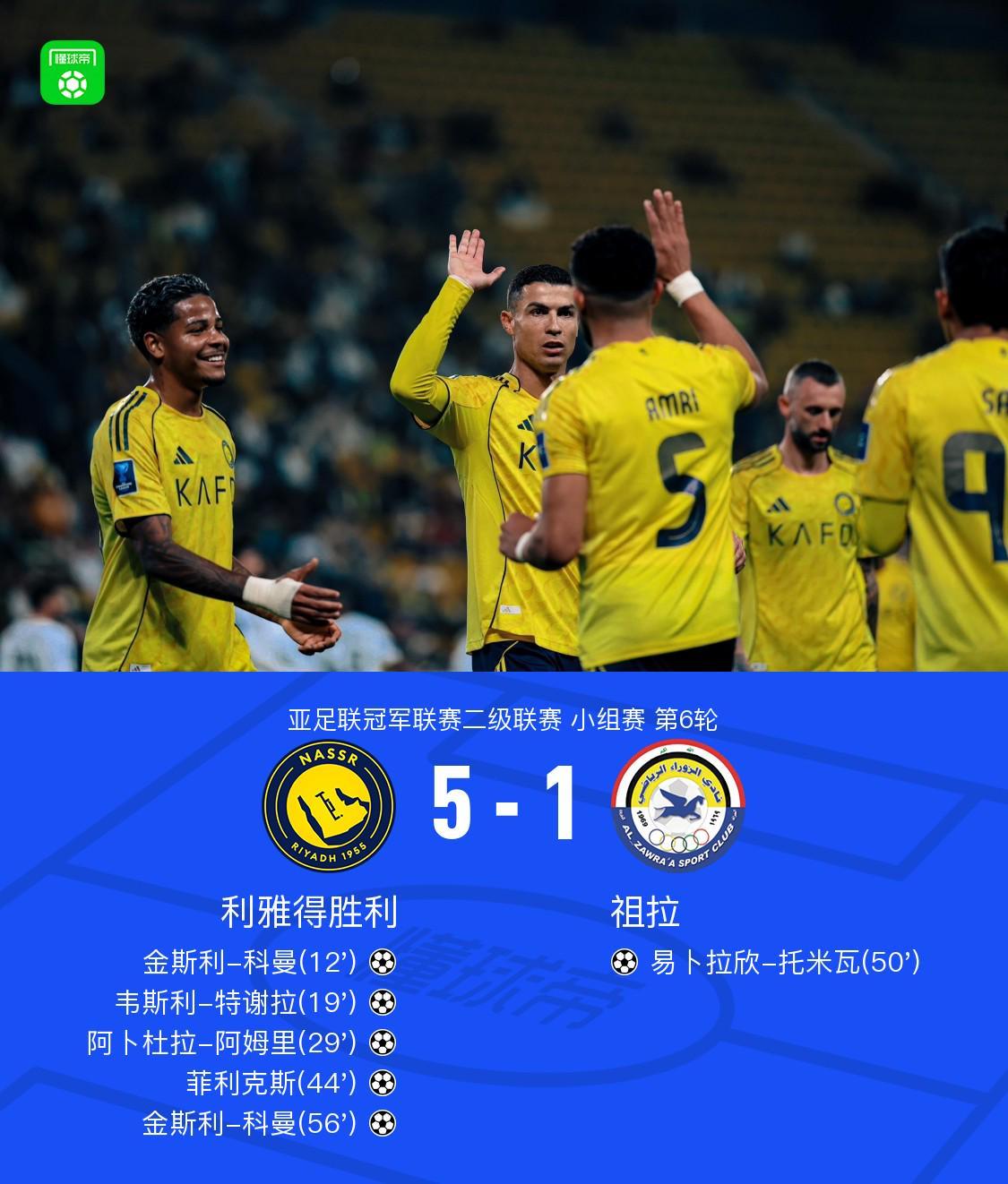 利雅得胜利5-1祖拉全胜战绩出线,C罗助攻,菲利克斯传射建功